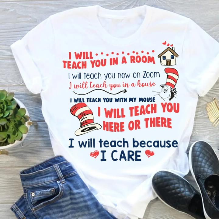 Adore I Will Teach You In A Room On Zoom In A House My Mouse I Care Cat In The Hat Teacher Shirt? Turn it into something truly special with our customization options! Pick your favorite design, colors, and style to showcase your individuality, convey a meaningful message, or design the ultimate one-of-a-kind gift.