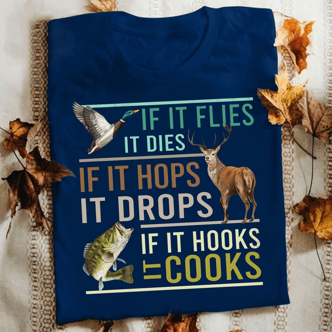 If it flies it dies, If it hops it drops, If it hooks it cooks, Funny Fishing Duck Deer Hunter T-Shirt
