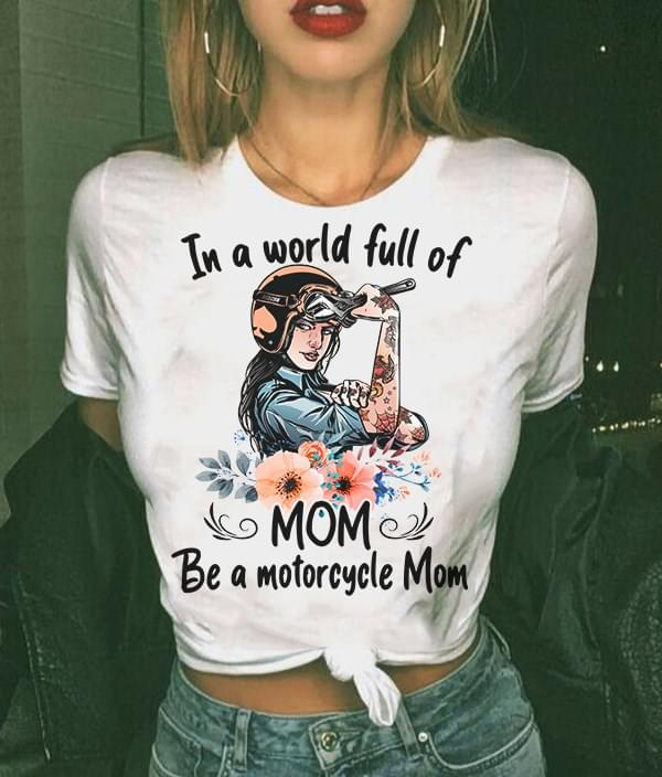 In A World Full Of Mom Be A Motorcycle Mom Lady Girl With Tattoos Wearing Helmet and Holding Monkey Wrench Shirt