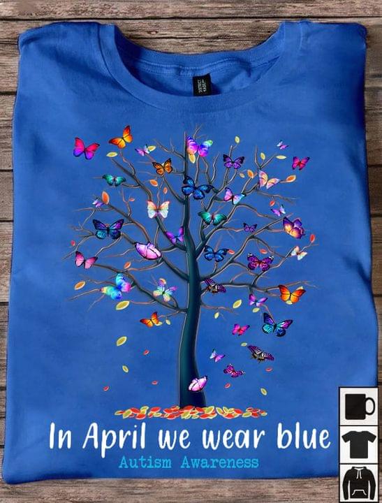 In April We Wear Blue Autism Awareness Butterfly Tree Shirt