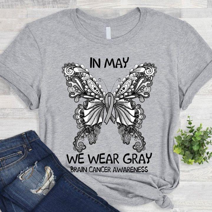 In May We Wear Gray Brain Cancer Awareness Beautiful Gray Butterfly Shirt