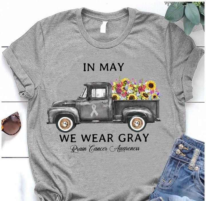 In May We Wear Gray Brain Cancer Awareness Gray Car Ribbon Flowers Shirt