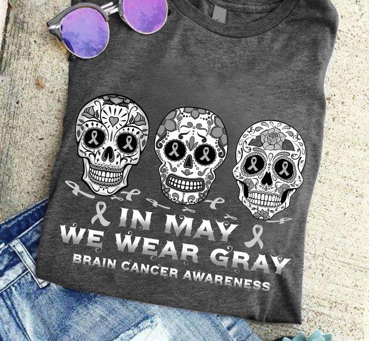 In May We Wear Gray Brain Cancer Awareness Gray Sugar Skulls Shirt