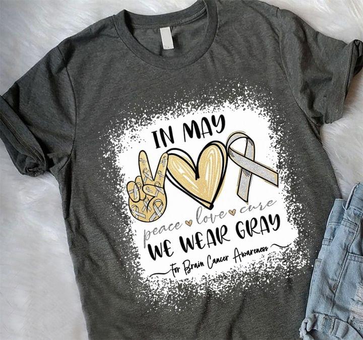 In May We Wear Gray For Brain Cancer Awareness Peace Love Care Hand Sign Heart Ribbon Shirt