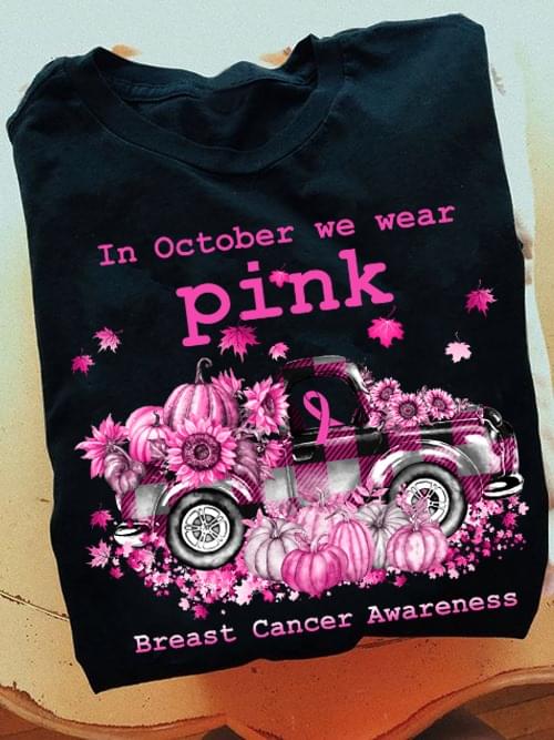 In October We Wear Pink Breast Cancer Awareness Pink Pumpkins Flowers Cars Shirt
