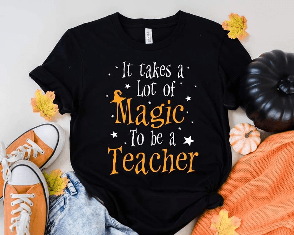 Adore It takes a lot of Magic to be a Teacher, Halloween T-Shirt? Turn it into something truly special with our customization options! Pick your favorite design, colors, and style to showcase your individuality, convey a meaningful message, or design the ultimate one-of-a-kind gift.